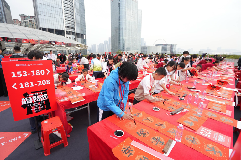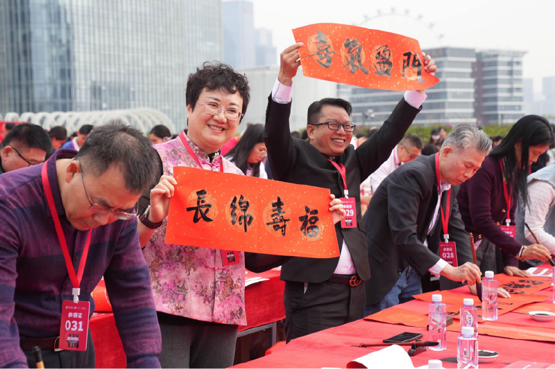 有港澳同胞专程奔赴现场,以笔墨连接湾区情谊;有银发长者凝神运笔,展现岁月沉淀的功底;有中小学生提笔写下童真祝福;也有网络达人用镜头记录这一文化时刻,让传统年俗在社交平台上焕发新活力。