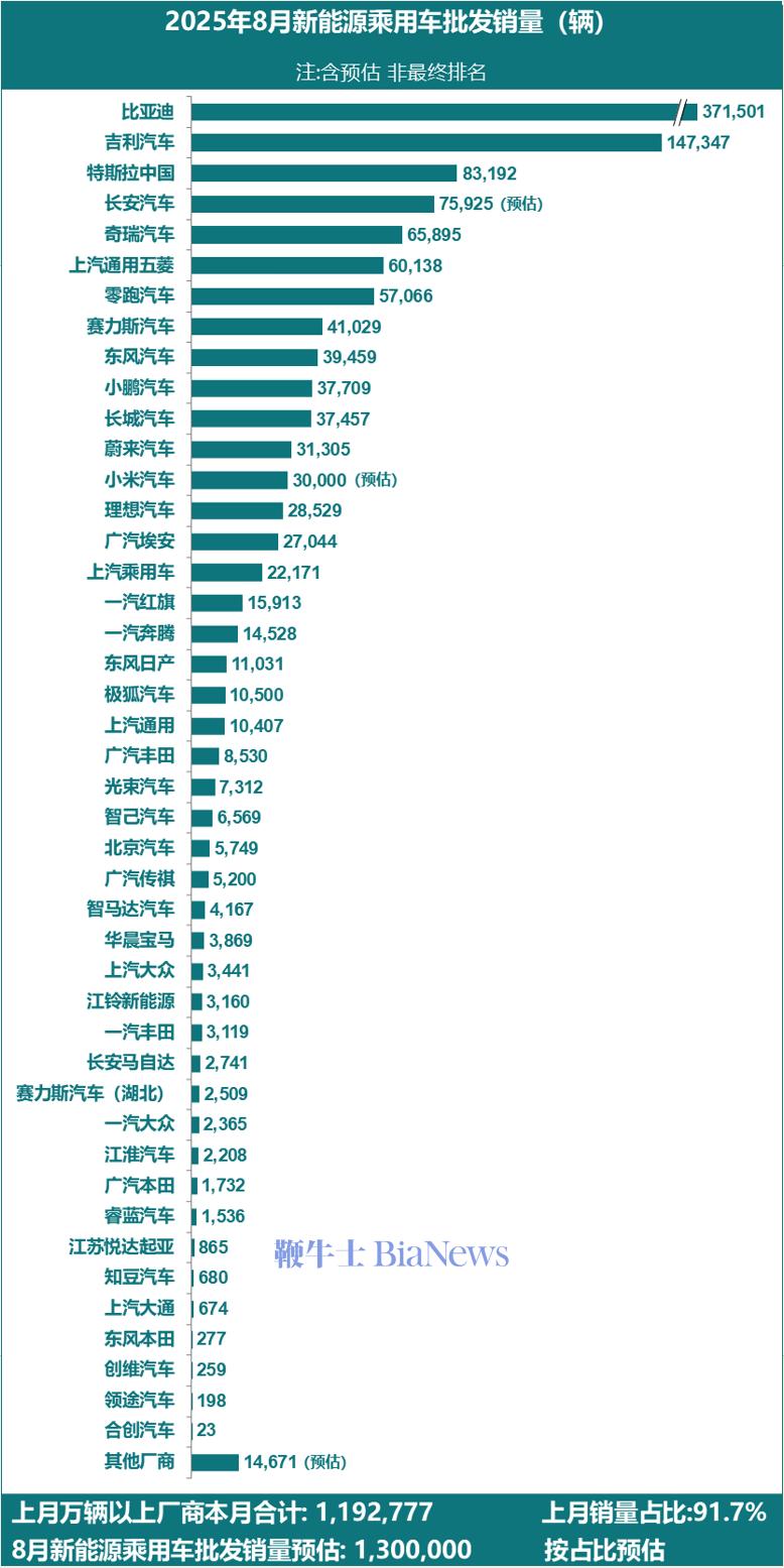 其中,比亚迪以371501辆的成绩位居榜首。吉利汽车排名第二炒股配资论坛,批发销量达到147347辆。特斯拉中国批发销量83192辆,排名第三。长安汽车以预估 75925辆的批发销量,位居第四。