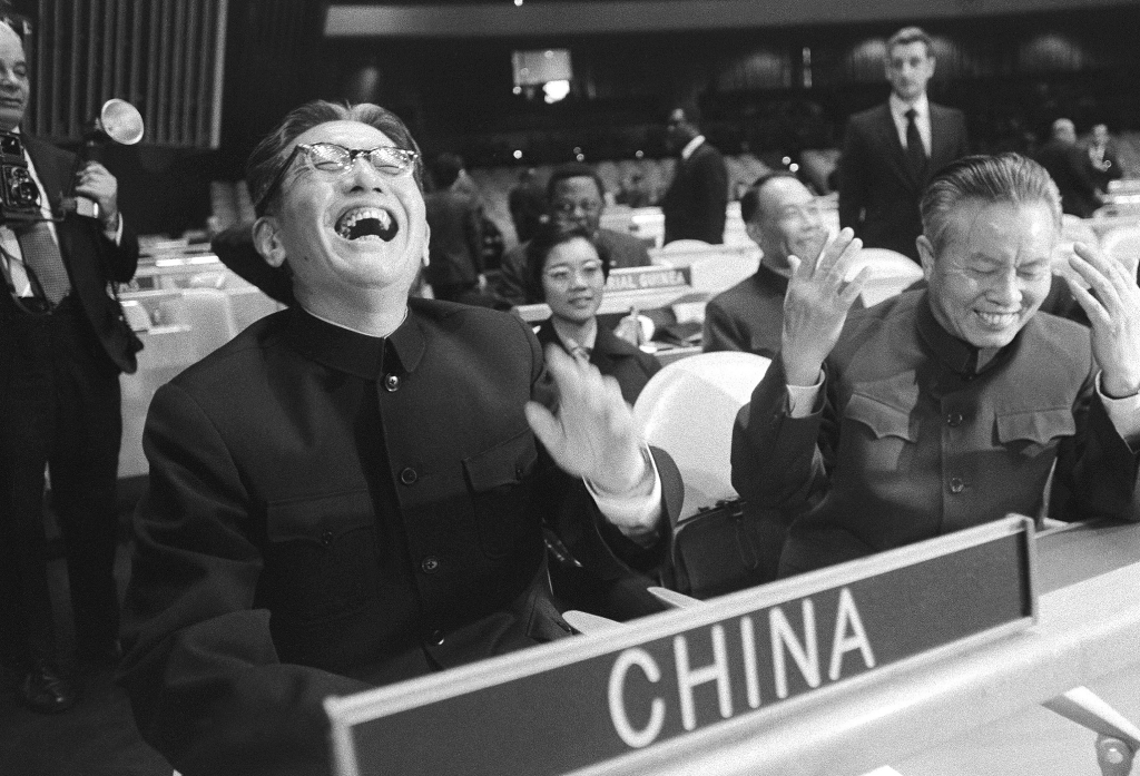 1971年11月15日,美国纽约,恢复联合国合法席位后,中国出席第26届联大全体会议。时任中国代表团团长乔冠华开怀大笑。视觉中国 图