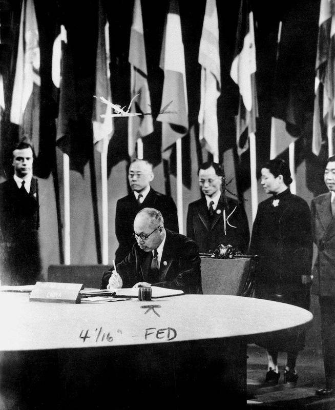 1945年6月,美国旧金山,中国共产党代表董必武用毛笔在《联合国宪章》上签字。新华社 图