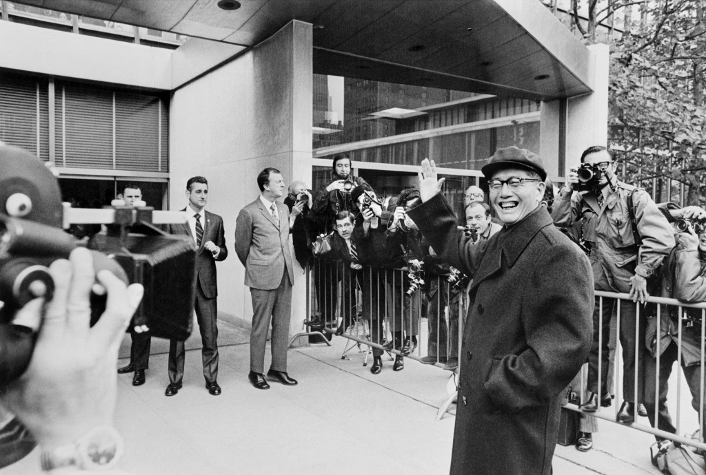 1971年11月12日,美国纽约,时任中国代表团团长、外交部副部长乔冠华在联合国总部向记者们挥手致意。新华社 图