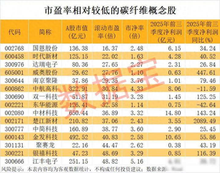 股市里的碳纤维公司最近都很活跃,中复神鹰、光威复材和新劲刚这些名字经常被提到,整个板块一个月内上涨了超过12%,其中神剑股份表现最突出,股价在一个月里翻了一倍还多,因为它给中车的高速磁悬浮列车提供了车体材料,各家公司的方向也不一样,中复神鹰专注于eVTOL飞机的预浸料,光威复材主要服务于火箭和卫星领域,新劲刚则在开发军用隐身材料,估值方面,有11家公司的市盈率低于40倍,国恩股份最低,只有16倍左右,他们正在研发一种耐高温的碳纤维增强塑料,针对特殊应用场景,看起来很有前景。