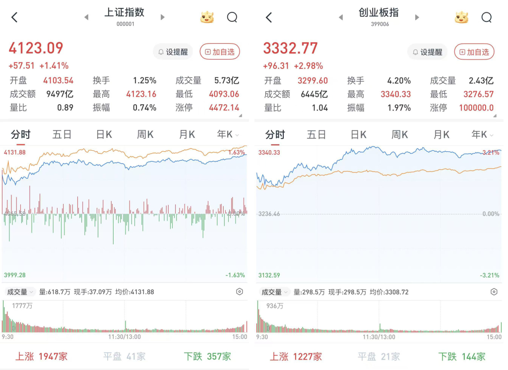 至收盘,上证综指涨1.41%,报4123.09点;科创50指数涨2.51%,报1458.16点;深证成指涨2.17%,报14208.44点;创业板指涨2.98%,报3332.77点。